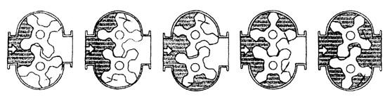 机械式双转子流量计对流体流量的测定是在计量腔体内完成的。以螺旋转子(测量元件)的空槽部分和计量箱内壁组成一封闭空腔(见图中阴影部分)作为测量室,转子每转一周可输出8倍空腔的容积,因此,流体的流量正比于螺旋转子的转速,将转子转数的累计转化为流体流量的计量(见图1)。