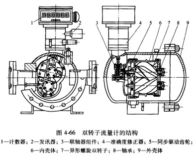 铸钢型双转子流量计的工作原理同上述各转子型流量计,也是靠流量计进出口间的流体压差推动。转子转动,通过测量转子的转速实现流量测量。互不接触的螺旋转子的轴上固定有同步驱动齿轮,以实现互相驱动。由于转子轴向呈螺旋形,并且安装于两个转子轴上的机构使转子之间始终保持适当的间隙,所以运行平稳、主要用于液体流址测量。注意,计址室的容积应为计量室 1和计量室2容积之和。