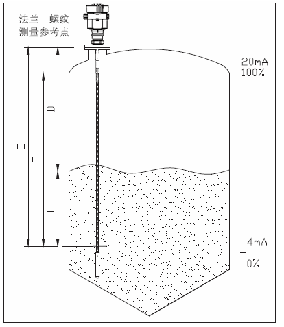 通过输入空罐高度E(=零点),满罐高度F(=满量程)及一些应用参数来设定,应用参数将自动 使仪表适应测量环境。对应于4…20mA输出;